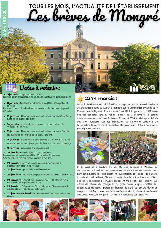 Dans ce nouveau numéro des Brèves de Mongré, vous trouverez un résumé de ce que nous avons vécu au sein de l'établissement durant le mois de janvier 2026, ainsi que les principales dates à retenir pour le mois de février qui commence. Bonne lecture !