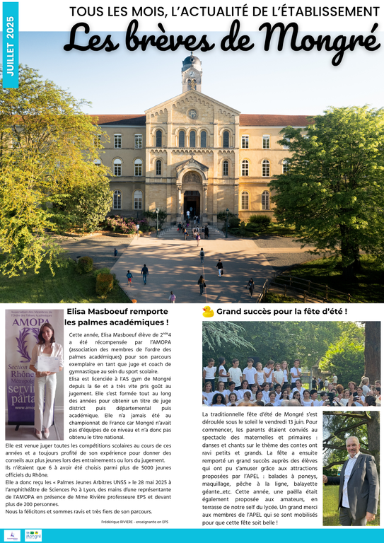Dans ce nouveau numéro des Brèves de Mongré, vous trouverez un résumé de ce que nous avons vécu au sein de l'établissement durant le mois de juin 2025. Bonne lecture et bonnes vacances !
