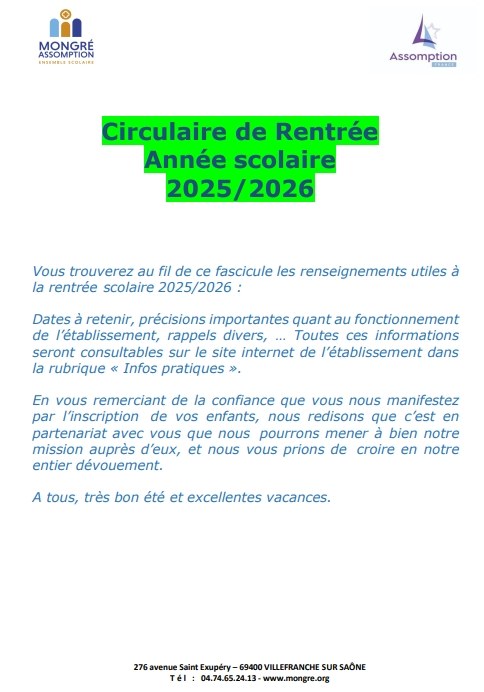 Voici les informations nécessaires à la préparation de la rentrée des Mongréens de la petite section à la terminale pour l'année scolaire 2025-2026. Bonnes vacances d'été à tous !