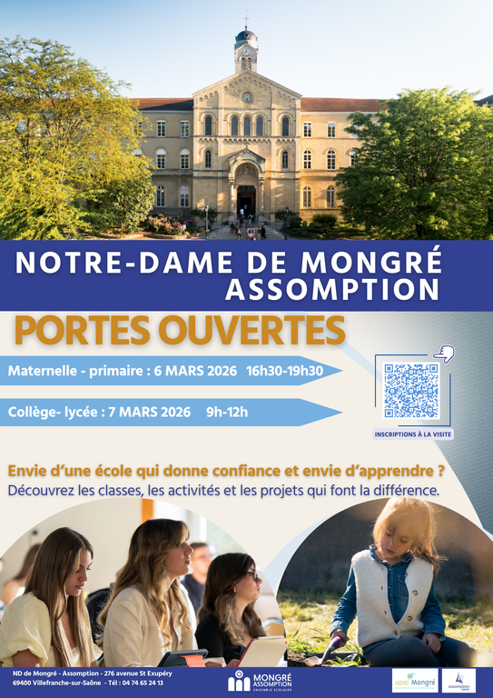 L'ensemble scolaire Notre-Dame de Mongré Assomption vous propose de venir découvrir les classes, les activités et les projets qui font la différence. L'école maternelle et primaire ouvrira ses portes le vendredi 6 mars de 16h30 à 19h, le collège et le lycée ouvriront leurs portes le samedi 7 mars de 9h à 12h. Inscriptions obligatoires, à partir du 12/01.
