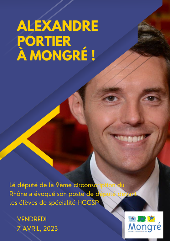 Le vendredi 7 avril 2023 de 13h30 à 15h30, les élèves de la spécialité HGGSP de Première ont eu la chance de recevoir Alexandre Portier, le député de la 9ème circonscription du Rhône, pour une intervention autour de son parcours et de son poste de député mais aussi à propos de l’organisation des Jeux Olympiques et Paralympiques à Paris en juillet 2024.
