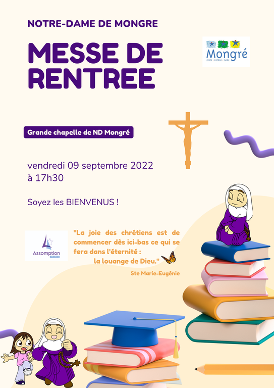 Soyez les bienvenus vendredi 9 septembre à 17h30 pour la messe de rentrée ! Tous, familles et communauté éducative, nous sommes heureux de nous retrouver pour cette année qui commence. Cette messe nous donne l'occasion de confier notre année au Seigneur. A l'issue de cette célébration, nous aurons la joie de nous retrouver autour d'un verre de l'amitié.