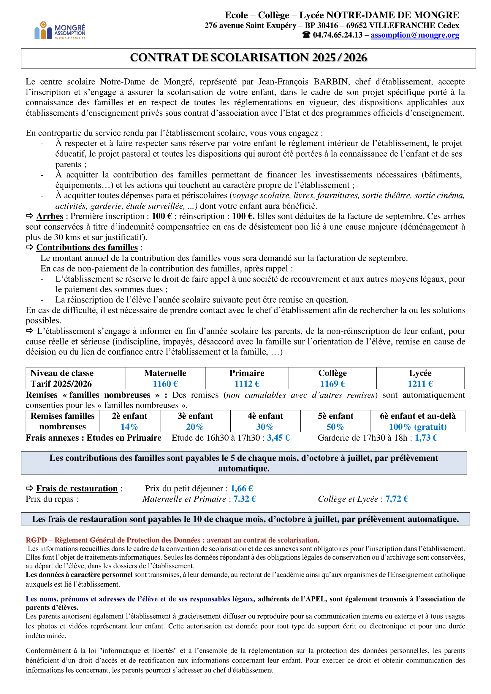Mongré Assomption est un établissement catholique d’enseignement, ouvert à tous ceux qui s’engagent à respecter les règlements de l’école, du collège et du lycée, les principes éducatifs et les valeurs de l’enseignement catholique, dans le respect des consciences de chacun.