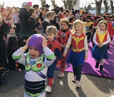 L'après-midi était réservée au défilé des plus petits : les élèves de maternelle et primaire ont été rassemblés dans la cour de l'école pour défiler par thème en rythme avec la musique. Les princesses ont ouvert le bal, suivies des fées, des super-héros, des animaux, des sportifs ou encore des cosmonautes. Les enseignants de ces classes étaient tous déguisés pour l'occasion et ont pu participer au défilé, puis au flash mob créé par les délégués de chaque classe.