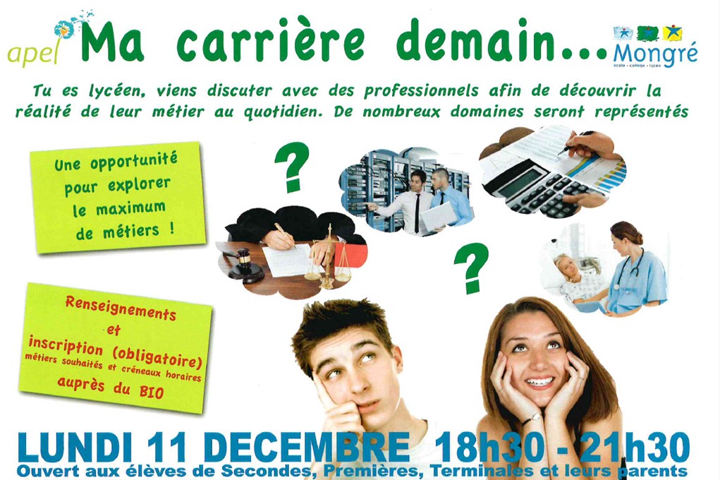 Venez rencontrer un grand nombre de professionnels lors de la grande soirée "Ma Carrière demain" organisée par l'APEL et le B.I.O. de Mongré et destinée aux élèves du lycée. Renseignements et inscriptions auprès de Gaëlle Ducrot au B.I.O. sur place ou par mail à g.ducrot@mongre.org.