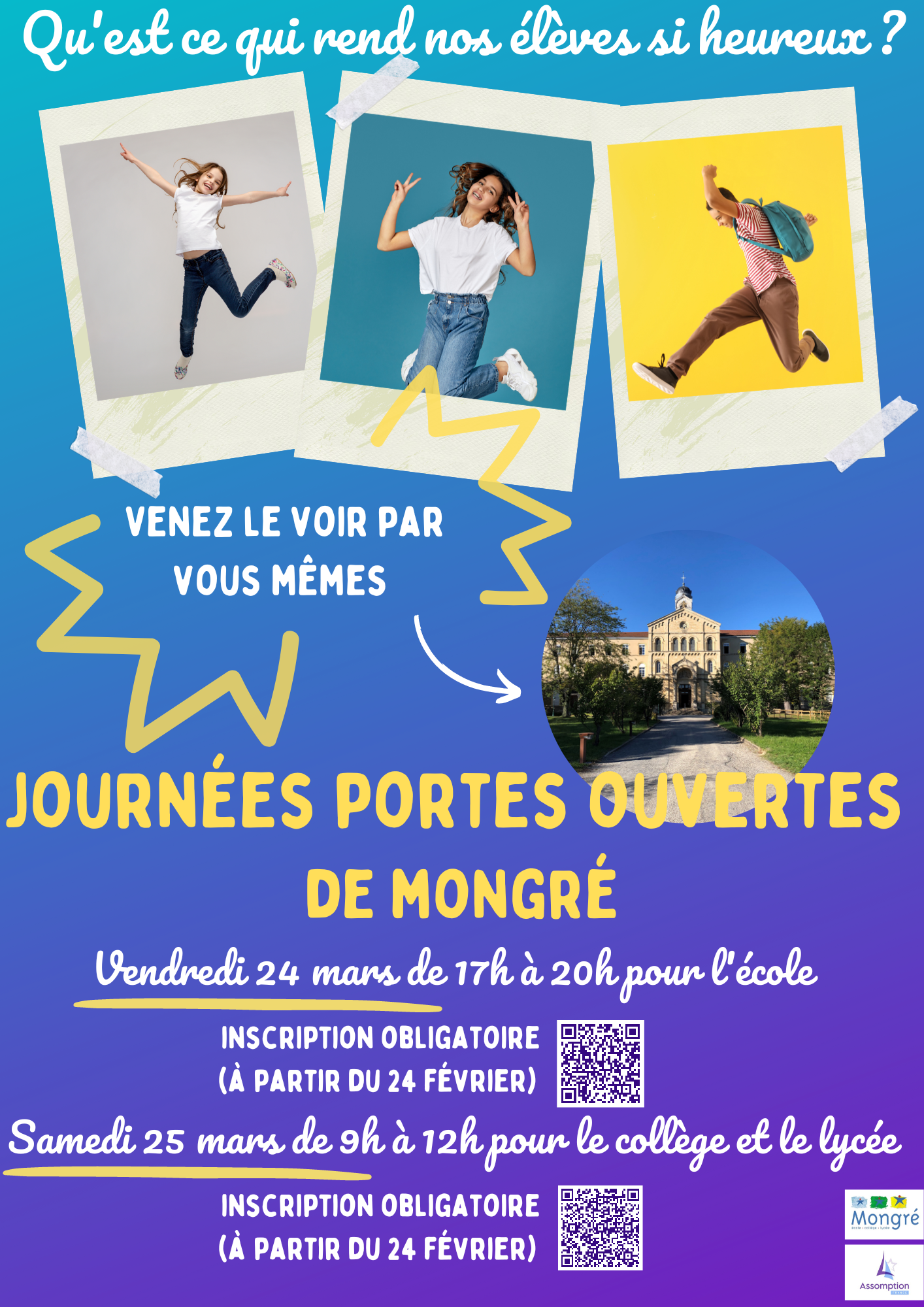 Chaque année, notre établissement Notre-Dame de Mongré ouvre ses portes aux visiteurs au mois de mars. Cette année, vous pourrez découvrir notre école maternelle et primaire le vendredi 24 mars de 17h à 20h et notre collège et notre lycée le samedi 25 mars de 9h à 12h.