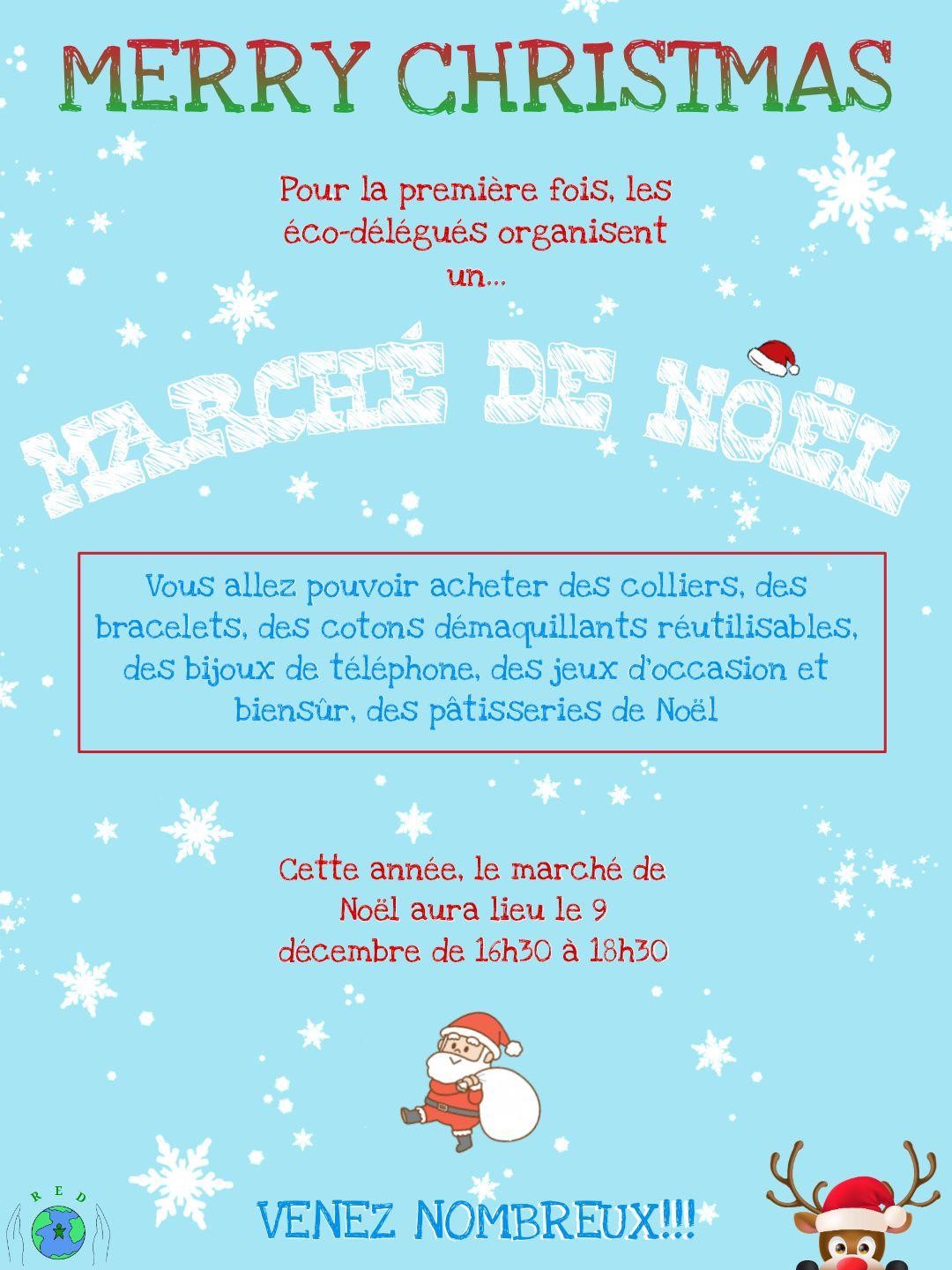 Les Eco-délégués du lycée proposent un marché de Noël éco-responsable le vendredi 9 décembre de 16h30 à 18h30. Cotons réutilisables, bijoux fabriqués à la main par les élèves, pâtisseries de Noël, jeux de société d'occasion et d'autres surprises seront à vendre à petits prix. Vous êtes tous les bienvenus !