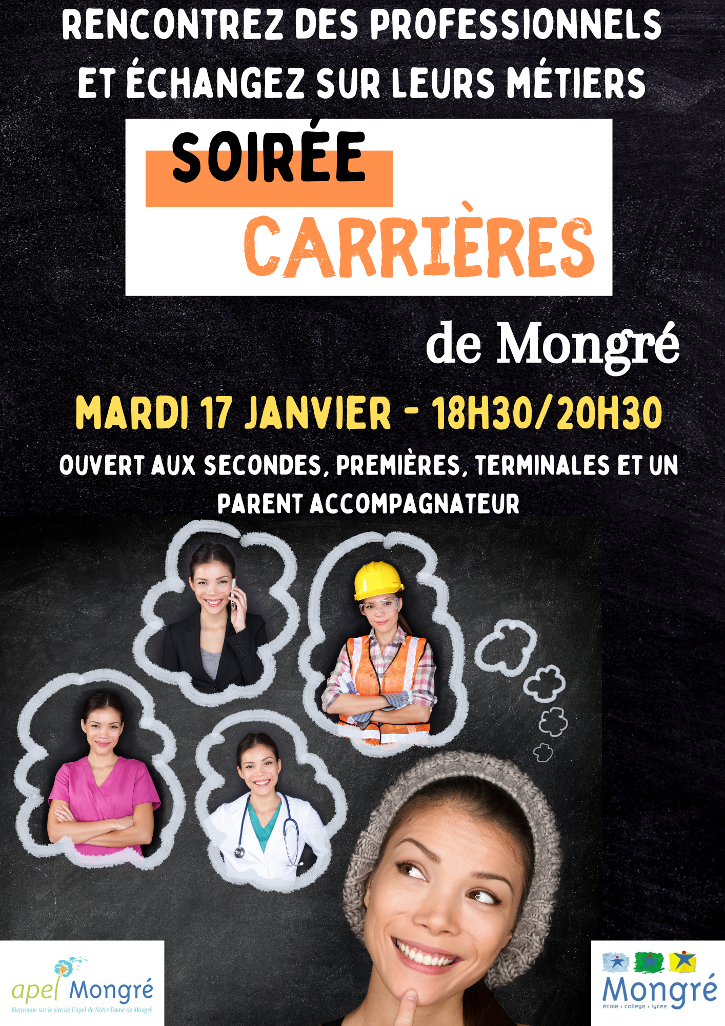 Le 17 janvier, les lycéens de Mongré sont invités à participer à la soirée Carrières de 18h30 à 20h30. Le but ? Rencontrer des professionnels dans différents secteurs d'activité afin de cerner au mieux les spécificités de chaque profession.