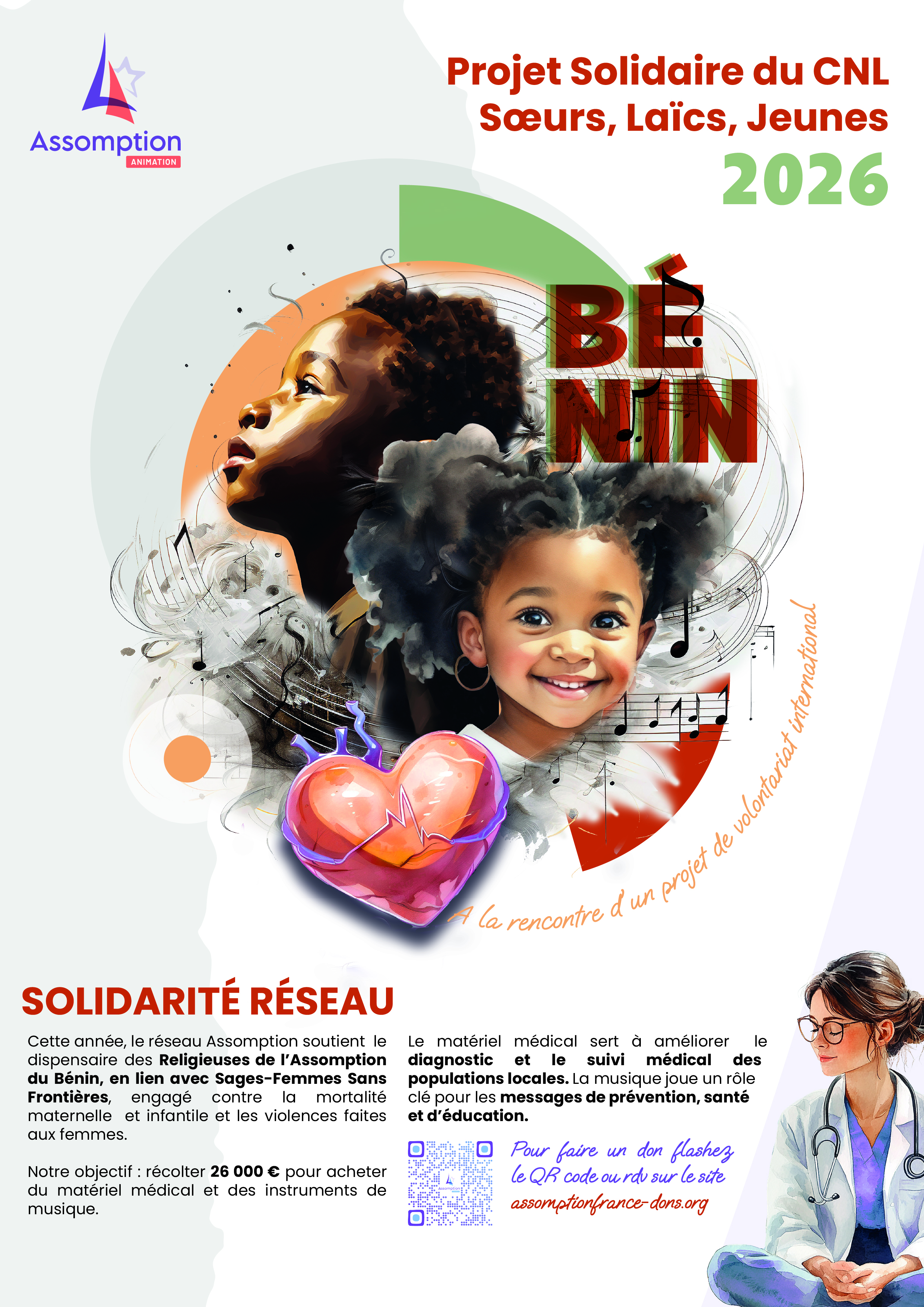 Chaque année, le réseau Assomption France choisit un projet solidaire à mener dans l'une des communautés ou l'un des établissements Assomption dans le Monde. Cette année, les établissements du réseau, à travers les élèves du Conseil National des Lycéens, vont devoir récolter 26 000 euros pour acheter du matériel médical dans un dispensaire au Bénin, en partenariat avec Sages Femmes sans frontières. Merci par avance à tous !