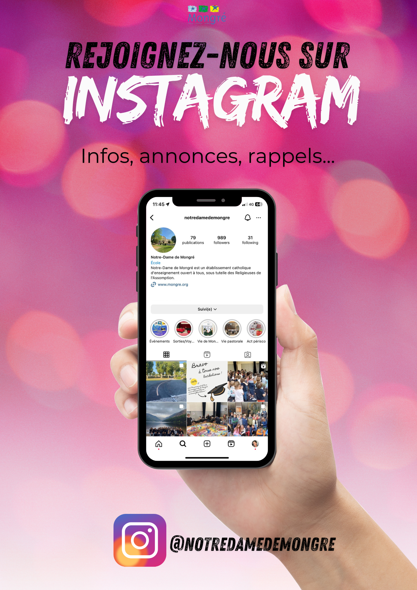 Notre établissement scolaire possède un compte Instagram @notredamedemongre, sur lequel nous diffusons différentes informations, annonces, rappels à destination des élèves et des parents. N'hésitez pas à vous y abonner !