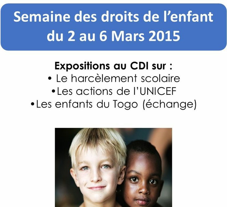 Dans le cadre du 25ème anniversaire de la Convention des Droits de l’Enfant, Le C.D.I. organise du 02 au 06 mars, une semaine de rencontres, d’expositions d’affiches et de travaux d’élèves sur la vie et les droits des enfants d’ici et d’ailleurs … A cette occasion les classes de 5ème entendront le témoignage de Noémya Grohan de l’association Gener-action solidaire sur le harcèlement en milieu scolaire. Une classe de Seconde aura été initiée par Virginie Mege, auteure, aux techniques du slam sur le thème respect filles/garçons.
