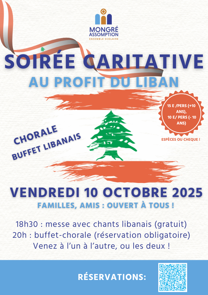 Vendredi 10 octobre 2025 à Notre-Dame de Mongré Assomption : soirée exceptionnelle dédiée au Liban, venez vivre une expérience unique où solidarité et convivialité se rencontrent.