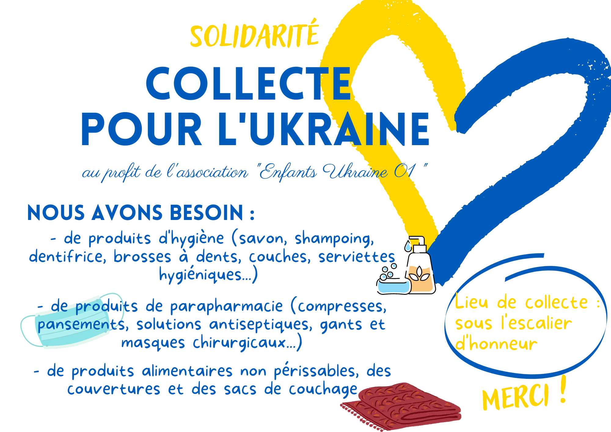 Vous avez été nombreux, élèves et parents, à demander que Mongré organise un projet solidaire au profit de l'Ukraine, c'est désormais chose faite ! Une collecte est lancée depuis ce mardi 15 mars pour "Enfants Ukraine 01" installée à Saint-Didier de Formans et qui oeuvre en faveur des familles ukrainiennes touchées par la guerre.