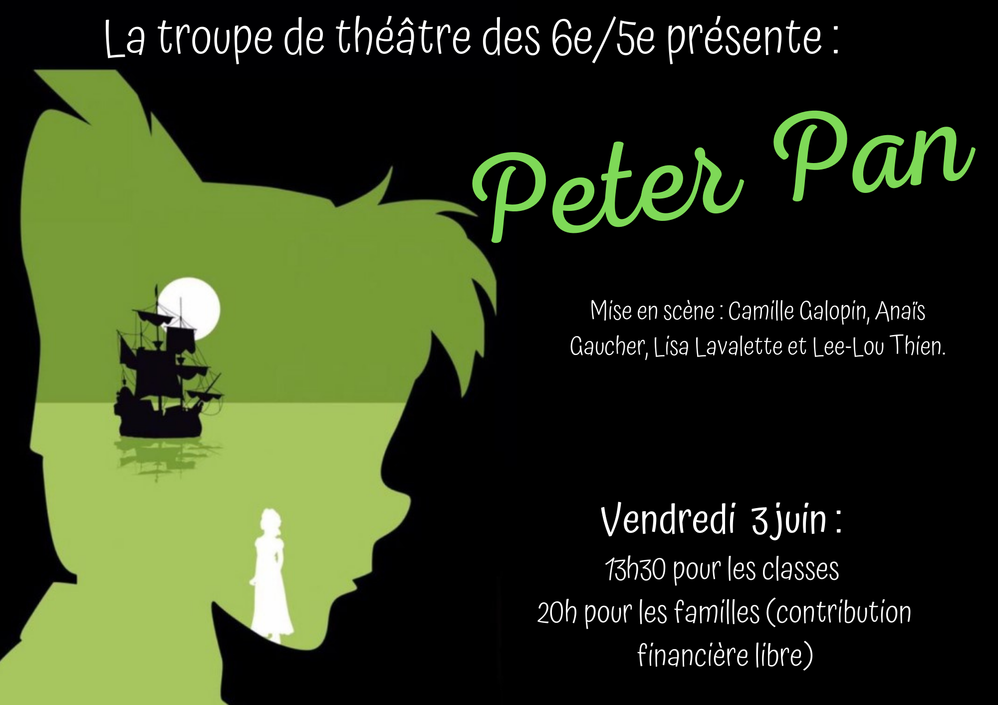 - La troupe des 6e/5e se plongera dans l'univers féérique de Peter Pan, mis en scène par 4 lycéennes de Mongré : Camille Galopin, Anaïs Gaucher, Lisa Lavalette et Lee-Lou Thien ! Venez rencontrer Peter, Wendy, Clochette, Crochet et les enfants perdus le vendredi 3 juin. Les classes pourront se rendre au spectacle à 13h30 (sur inscription) et les familles seront les bienvenues à 20h (contribution financière libre).
