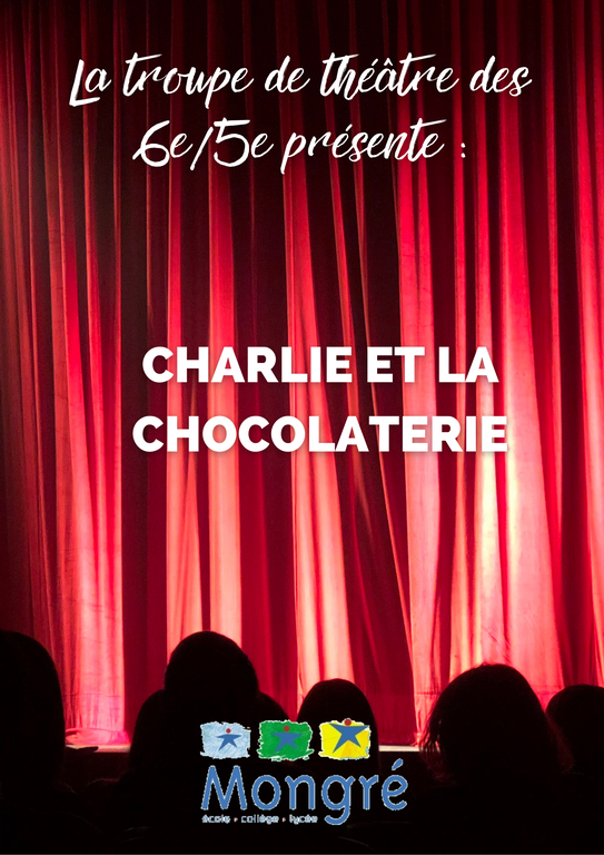 La tradition théâtrale perdure à Mongré ! Lors de l'année scolaire 2022-2023, la troupe de théâtre des 6èmes et 5èmes a travaillé de nombreuses séances sur une adaptation de "Charlie et la Chocolaterie". Pour la dernière année, les petits comédiens étaient dirigés par quatre élèves de Terminale qui ont écrit, monté et mis en scène la pièce : Camille Galopin, Anaïs Gaucher, Lisa Lavalette et Lee-Lou Thien.