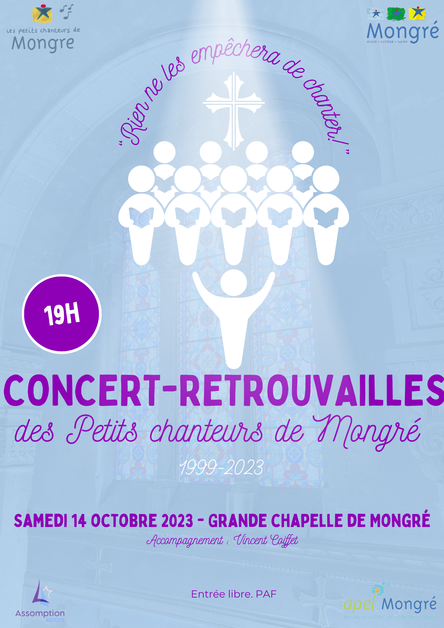 Les Petits Chanteurs de Mongré, depuis leur création en 1999, se retrouvent pour un concert exceptionnel dans la grande chapelle de Mongré le 14 octobre 2023 à 19h. Soyez nombreux à nous rejoindre pour cette soirée unique !